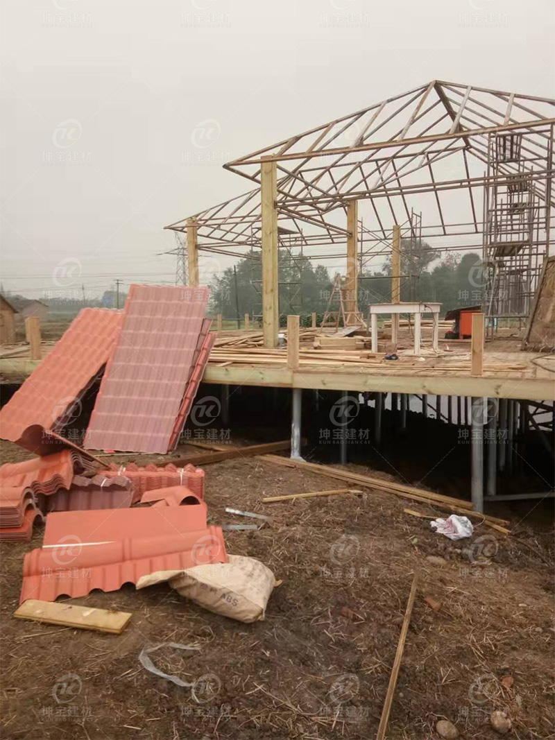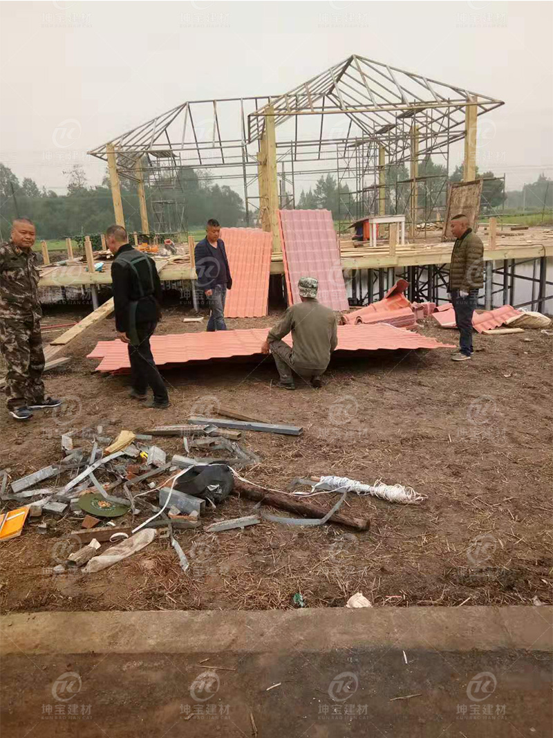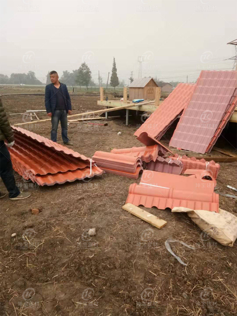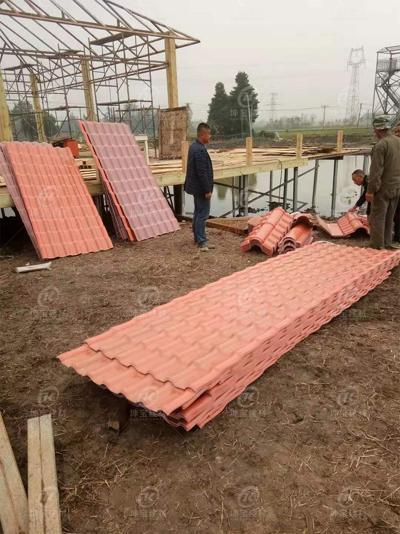 大邑度假村項目的接待室采購合成樹脂瓦用作屋面瓦,采購商是大邑潤地農業有限公司,采購清單300米,橘橙色,3.0MM厚樹脂瓦,屋面整體采用的是防腐木做支撐。