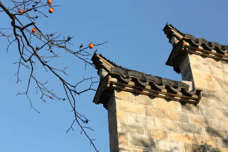 屋脊獸飾的總稱吻獸,吻獸跟挑角多彩當屬寺廟祠堂建筑上,挑角又名翅角、撓角。平遙古城深藏著珍稀的人物驅獸屋脊圖。昆明圓通寺屋頂正中的寶塔氣派端正,翅角飛禽走獸象是在排隊觀日出。山東徐福家鄉紀念性建筑物,徐公祠大殿翅角獸伸著脖子像在嗅盛開的櫻花?;罩莨僬蓓數镊梓腼@示著此處宅院與民宅不同。塔川柿子熟了遲遲不愿離開枝頭,膩著相處多日的翅角竊竊私語。古城臨安天君廟的挑角,向著無暇天空笑靨如花。