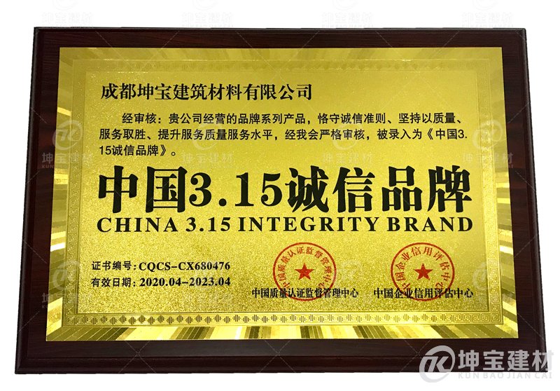 榮譽見證實力,2020年4月“坤寶合成樹脂瓦”品牌入選了“315誠信品牌”,并獲得主辦方頒發的證書和牌匾,這是一份沉甸甸的榮譽,也是一份認可、一份鼓勵,讓“坤寶樹脂瓦”走得更穩、更遠、飛得更高。