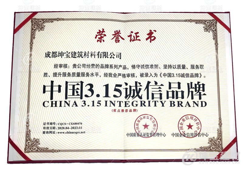 由中國質量認證監督管理中心舉辦,通過對千余家企業的誠信、質量情況進行明察暗訪, 并結合企業信用評估中心,由專家組嚴格審核后,坤寶樹脂瓦以優異表現榮獲由中國質量認證監督管理中心,中國企業信用評估中心頒發的“中國315誠信品牌”,得到公會和業內專家的一致認可。坤寶樹脂瓦憑借可靠的企業信用,過硬的產品質量,和優質的售后 服務,順利通過考核,獲此殊榮。
