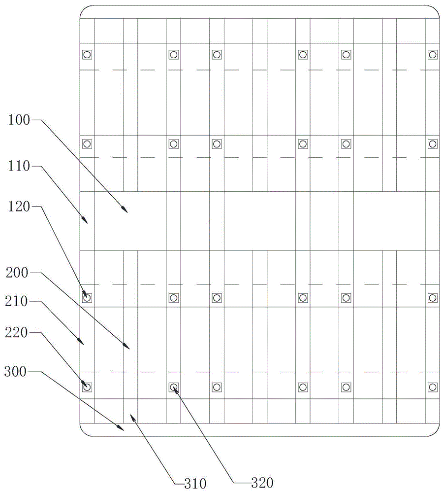 100、**樹脂瓦;110、**連接桿;120、**連接孔;130、**凹槽;140、**卡合塊;200、連接瓦;210、連接桿;220、連接孔;230、凹槽;240、卡槽;250、卡合塊;300、第二樹脂瓦;310、第二連接桿;320、第二連接孔;330、第二凹槽;340、第二卡槽。