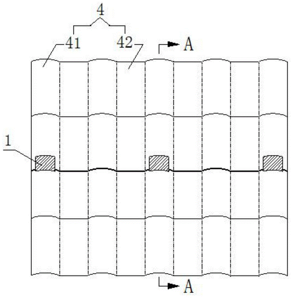 附圖中:1-弧形夾板,2-連桿,3-擋板,4-合成樹脂瓦,41-波峰,42-波谷,5-檀條,51-**通孔,52-第二通孔,6-彈簧,7-套筒。
