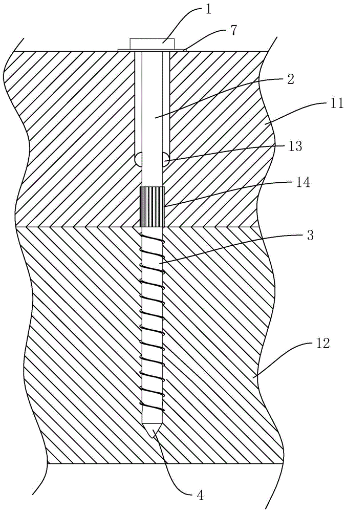 如圖2和圖3,光桿部2與螺紋部3接觸的部分安裝有圓臺形狀的螺紋擴孔刀6,螺紋擴孔刀6與螺紋部3連接的部分到與光桿部2連接的部分直徑逐漸變大,螺紋擴孔刀6與螺紋部3連接的部分牙外徑與螺紋部3的牙外徑平齊,螺紋擴孔刀6與光桿部2連接的部分牙外徑大于螺紋部3的牙外徑,螺紋擴孔刀6上的螺紋間距與螺紋部3的螺紋間距相同。向樹脂瓦11到搭條12打入自攻螺絲至螺紋擴孔刀6完全通過樹脂瓦11部分進入搭條12,從而使自攻螺絲打入樹脂瓦11的部分完全被擴孔,減少了自攻螺絲與樹脂瓦11接觸可能會因天氣炎熱,樹脂瓦11受熱膨脹而與自攻螺絲擠壓產生裂縫。