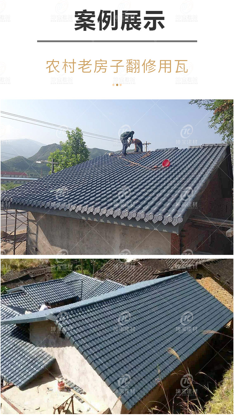古建筑作為歷史的見證者,在時代的發展中存在著重要意義,為了讓這些文化長久的生存下來,既要進行合理的維護也要繼承和發揚。仿古合成樹脂瓦可以規避傳統青瓦、琉璃瓦等仿古瓦材易碎、易裂、容易掉落等問題;功能上防腐耐候、防火阻燃還可抵抗冰雹等襲擊瓦面不損壞,而且經雨水沖刷還自潔如新。
