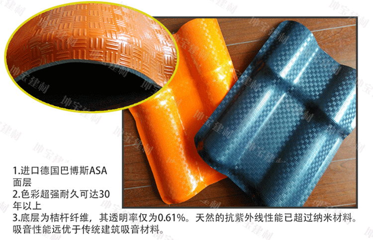 秸稈纖維聚酯瓦主體聚酯和表面聚酯都是具有特別好的耐腐蝕性能。不會被暴雨侵蝕,并可以長期抵御酸、堿、鹽等化學物質的侵蝕。試驗表明秸稈聚酯瓦在低溫凍融循環下,產品不會變形或變色,各種微生物也無法在瓦的表面生存。